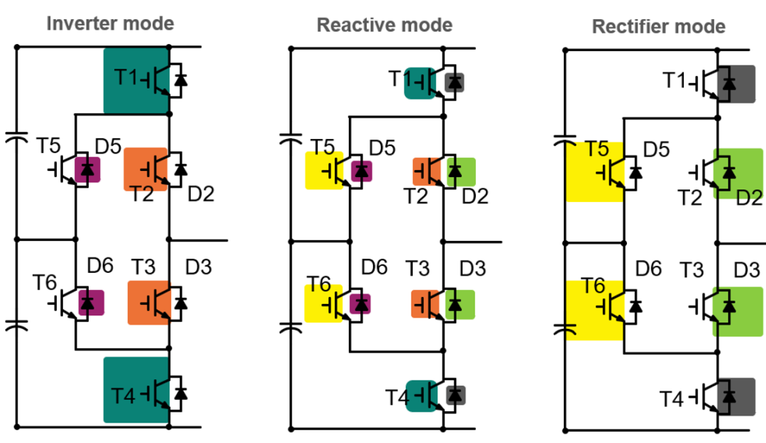 逆变工况下,损耗集中在T1/T4,T2/T3,D5/D6;