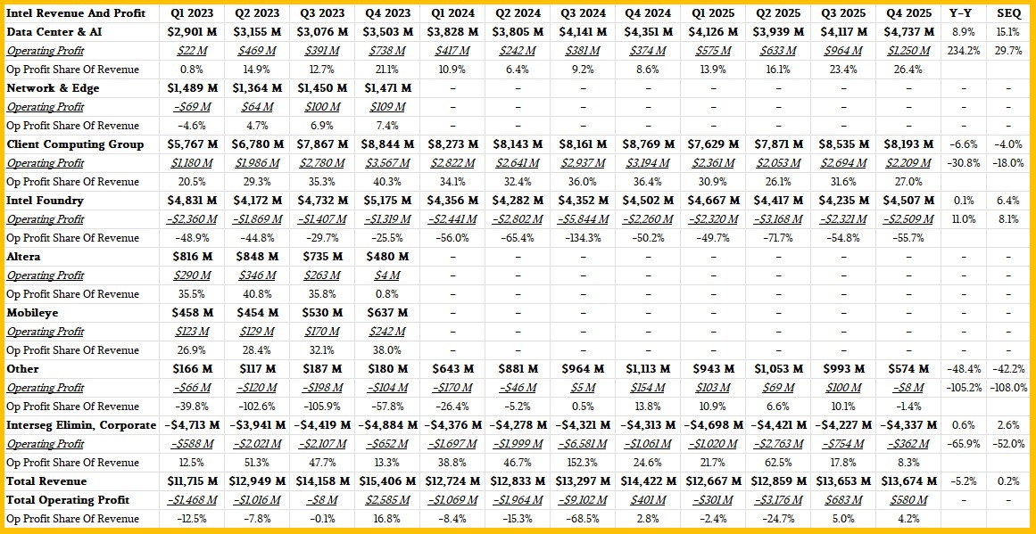 我们在2025年第四季度看到,英特尔在财务报表中仍被称为数据中心与人工智能集团的业务额达到了47.4亿美元,但该集团使用了旧的数据中心集团名称,同比增长8.9%,环比增长15.1%。这不是生成式人工智能的繁荣增长,但也不是衰退。此外,数据中心集团的营业利润达到12.5亿美元,同比增长33倍,环比增长近30%。考虑到所有情况,这很不错,也反映了高性能计算和人工智能系统对高端CPU的需求,这些系统虽然CPU数量不多,但往往使用最昂贵的CPU来维持更昂贵的GPU或XPU的数据。